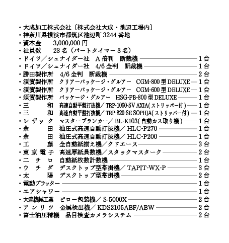 | 関連会社 | 【大成加工株式会社(印刷物加工部門)】 神奈川県横浜市都筑区池辺町3244番地 MAP TEL 045-929-0201045-929-0201 FAX 045-929-0256 【有限会社アイズ(アッセンブリ部門)】 神奈川県横浜市都筑区佐江戸町850番地 MAP TEL 045-936-2121045-936-2121 FAX 045-936-2774 |